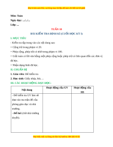 ọ sinh: Giấy nháp, bút, ... III. CÁC HOẠT Đ N Ộ G D Y Ạ H C Ọ : Hoạt đ ng c ộ a G ủ V Hoạt đ ng c ộ a ủ N i ộ dung HS - Đề ki m ể tra GV làm sẽ d a vào m ự a tr n đ ậ ề c a ủ phòng giáo d c ụ và nhà trư ng. ờ