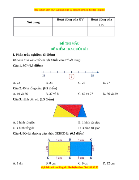 Hoạt đ ng c ộ a G ủ V Hoạt đ ng c ộ a ủ N i ộ dung HS ĐỀ THI MẪU ĐỀ KIỂM TRA CU I Ố KÌ I I. Phần tr c nghi ắ m ệ . (3 đi m ể )