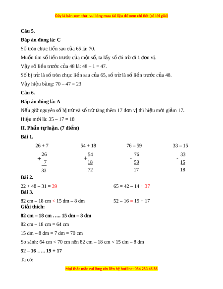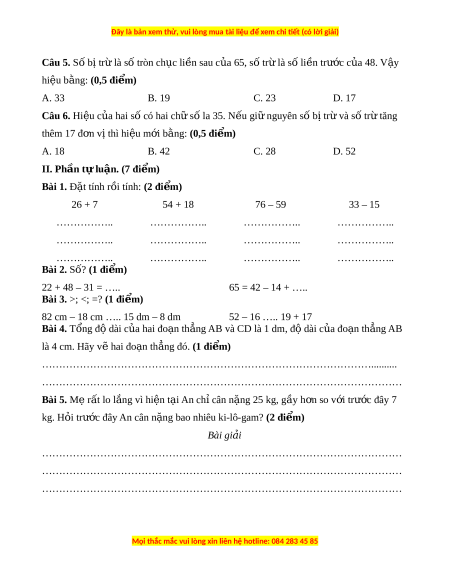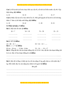 Câu 5. Số bị tr l ừ à số tròn ch c l ụ i n s ề au c a ủ 65, s t ố r l ừ à s l ố i n t ề rư c ớ c a 48. ủ V y ậ hiệu b ng: ằ (0,5 đi m ể ) A. 33 B. 19 C. 23 D. 17 Câu 6. Hi u c ệ a ủ hai số có hai ch s ữ ố la 35. N u gi ế nguyên s ữ ố b t ị r và s ừ ố tr t ừ ăng thêm 17 đ n ơ v t ị hì hi u m ệ i ớ b ng: ằ (0,5 đi m ể ) A. 18 B. 42 C. 28 D. 52 II. Phần t l ự u n. ( ậ 7 đi m ể ) Bài 1. Đ t ặ tính r i ồ tính: (2 đi m ể ) 26 + 7 54 + 18 76 – 59 33 – 15 …………….. …………….. …………….. …………….. …………….. …………….. …………….. …………….. …………….. …………….. …………….. ……………..