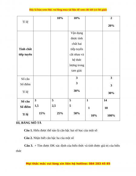 10% 10% 2 Tỉ lệ 20% Vận dụng được tính chất hai Tính chất tiếp tuyến tiếp tuyến cắt nhau và hệ thức lượng trong tam giác Số câu 3 3 Số điểm 3 3 Tỉ lệ 30% 30% Số câu 3 5 5 1 14 Số điểm 1,5 2,5 5 1 10 Tỉ lệ 15% 25% 50% 10% 100% III, BẢNG MÔ TẢ