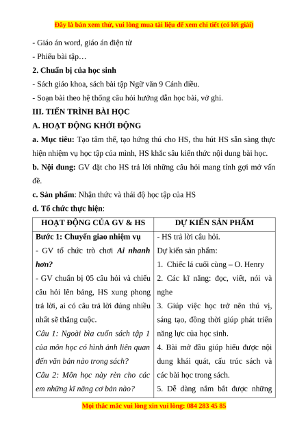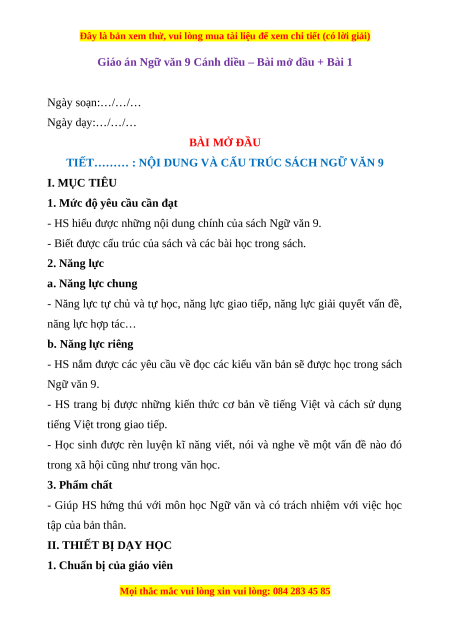 Giáo án Ngữ văn 9 Cánh diều – Bài mở đầu + Bài 1 Ngày soạn:…/…/… Ngày dạy:…/…/… BÀI MỞ ĐẦU