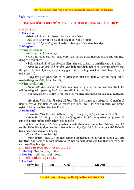 BÀI MỞ ĐẦU (1 tiết). MÔN ĐỊA LÍ VỚI ĐỊNH HƯỚNG NGHỀ NGHIỆP I. MỤC TIÊU 1. Kiến thức:
