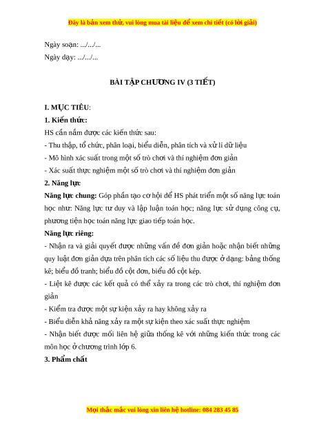 Đây là bản xem th , vu ử i lòng mua tài li u ệ đ xe ể m chi ti t ế (có l i ờ gi i ả ) Ngày so n: ạ .../.../... Ngày d y: ạ .../.../... BÀI TẬP CHƯ N Ơ G IV (3 TI T Ế ) I. M C Ụ TIÊU: 1. Ki n t ế h c ứ : HS c n n ầ m ắ đư c ợ các ki n t ế h c s ứ au: - Thu th p, t ậ ổ ch c, phân l ứ o i ạ , bi u di ể n, phân t ễ ích và x l ử í d l ữ i u ệ