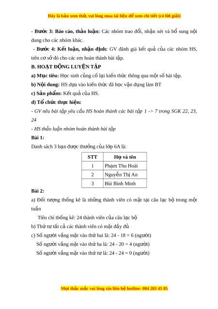 ậ 1 -> 7 trong SGK 22, 23, 24 - HS th o ả lu n nhóm ậ hoàn thành bài t p ậ Bài 1: Danh sách 3 b n đ ạ ư c ợ thư ng c ở a ủ l p 6A ớ là: STT Họ và tên 1 Ph m ạ Thu Hoài 2 Nguy n ễ Th ịAn 3 Bùi Bình Minh Bài 2: a) Đối tư ng ợ th ng ố kê là nh ng ữ thành viên có m t ặ t i ạ câu l c ạ bộ trong m t ộ tuần