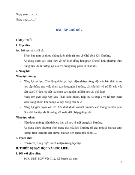 Giáo án Bài tập chủ đề 2 Vật Lí 12 Cánh diều
