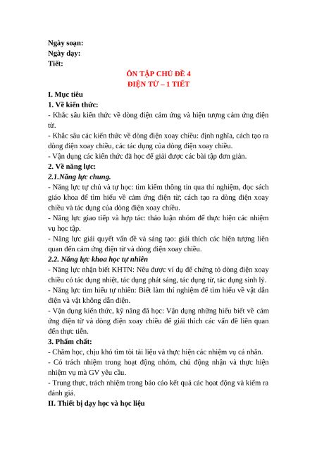 ĐIỆN TỪ – 1 TIẾT I. Mục tiêu 1. Về kiến thức: