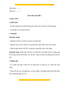 Đây là bản xem th , vu ử i lòng mua tài li u ệ đ xe ể m chi ti t (c ế ó l i ờ gi i ả ) Ngày so n: ạ …/…/… Ngày d y: ạ …/…/… BÀI TẬP CH Đ Ủ 3 Ề I. M C Ụ TIÊU: 1. Ki n t ế h c ứ : - Ôn t p, ậ tổng k t ế toàn bộ n i ộ dung ki n t ế h c c ứ a ủ cả chủ đ ề “Năng lư ng”. ợ - Luyện t p các ậ kĩ năng tính toán. 2. Năng l c ự Năng l c ự chung: - Năng l c t ự ch ự và t ủ ự h c t ọ rong tìm tòi khám phá. - Năng l c gi ự ao ti p và h ế p t