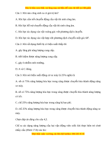A. gây lãng phí năng lư ng ợ cung c p. ấ B. ti t ế ki m ệ đư c năng ợ lư ng cung c ợ p. ấ C. gây ô nhi m ễ môi trư ng. ờ D. A và C đúng. Câu 3: Khi nói hi u s ệ u t ấ đ ng c ộ ơ xe máy là 25% nghĩa là A. sẽ có 75% năng lư ng ợ hóa h c ọ trong xăng đư c ợ chuy n ể hóa thành đ ng ộ năng xe máy. B. sẽ có 75% năng lư ng ợ hóa h c ọ trong xăng đư c ợ chuy n ể hóa thành năng lư ng ợ có ích.