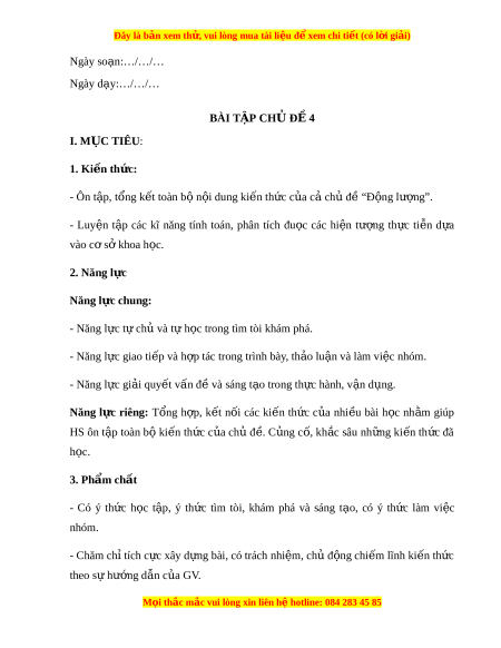 Đây là bản xem th , vu ử i lòng mua tài li u ệ đ xe ể m chi ti t (c ế ó l i ờ gi i ả ) Ngày so n: ạ …/…/… Ngày d y: ạ …/…/… BÀI T P Ậ CH Đ Ủ Ề 4 I. M C Ụ TIÊU: 1. Ki n t ế h c ứ : - Ôn t p, ậ tổng k t ế toàn bộ n i ộ dung ki n t ế h c c ứ a ủ cả chủ đ ề “Đ ng l ộ ư ng”. ợ - Luy n ệ t p