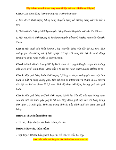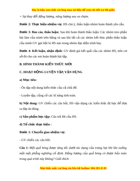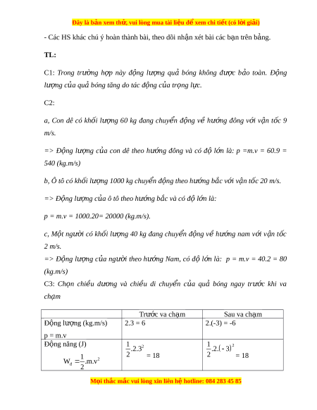 Đây là bản xem th , vu ử i lòng mua tài li u ệ đ xe ể m chi ti t (c ế ó l i ờ gi i ả ) + S t ự hay đổi đ ng l ộ ư ng, ợ năng lư ng s ợ au va ch m ạ . Bư c ớ 2: Th c hi ự n nhi ệ m ệ v : ụ HS chú ý, th o ả lu n nhóm ậ hoàn thành yêu c u. ầ Bư c ớ 3: Báo cáo, th o ả lu n: