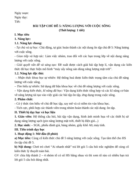 - Tự chủ và tự học: Chủ động, tự giác hoàn thành các nội dung ôn tập chủ đề 5: Năng lượng với cuộc sống.