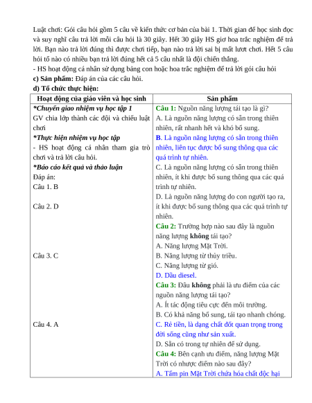 về năng lượng tái tạo vào việc giải các bài tập ôn tập, ứng dụng trong cuộc sống. 2. Phẩm chất: