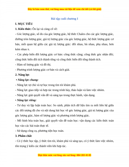 góc lượng giác, hàm số lượng giác và phương trình lượng giác.