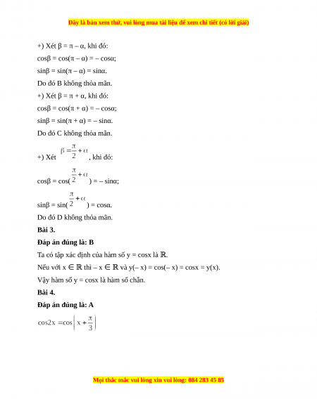 sinβ = sin(π + α) = – sinα. Do đó C không thỏa mãn. +) Xét , khi đó: cosβ = cos( ) = – sinα; sinβ = sin( ) = cosα. Do đó D không thỏa mãn. Bài 3. Đáp án đúng là: B