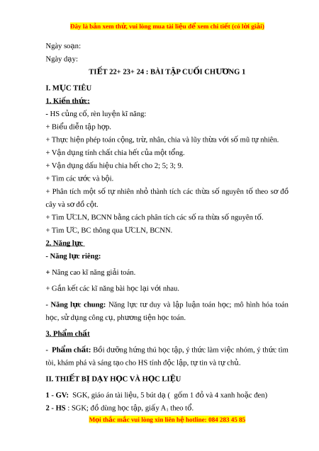TIẾT 22+ 23+ 24 : BÀI TẬP CU I Ố CHƯ N Ơ G 1 I. M C Ụ TIÊU 1. Ki n t ế h c ứ : - HS c ng ủ c , r ố èn luy n kĩ ệ năng: + Bi u di ể n t ễ p ậ h p. ợ + Th c hi ự n phép t ệ oán c ng, t ộ r , nhân, chi ừ a và lũy th a v ừ i ớ s m ố ũ t nhi ự ên. + V n ậ d ng t ụ ính ch t ấ chia h t ế c a m ủ t ộ t ng. ổ + V n ậ d ng d ụ u hi ấ u chi ệ a h t ế cho 2; 5; 3; 9. + Tìm các ư c ớ và b i ộ . + Phân tích m t