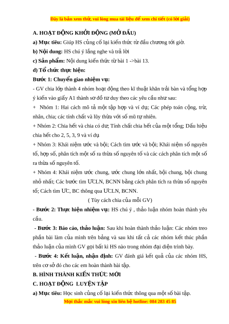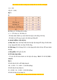 ế cho 2, 5, 3, 9 và ví dụ + Nhóm 3: Khái ni m ệ ư c ớ và b i ộ ; Cách tìm ư c ớ và b i ộ ; Khái ni m ệ s ố nguyên tố, h p ợ số, phân tích m t ộ s ố ra th a ừ s nguyên ố t và ố các cách phân tích m t ộ số ra th a ừ s nguyên t ố . ố + Nhóm 4: Khái ni m ệ ư c ớ chung, ư c ớ chung l n ớ nh t ấ , b i ộ chung, b i ộ chung nhỏ nh t ấ ; Các bư c ớ tìm C Ư LN, BCNN b ng ằ cách phân tích ra th a ừ s ố nguyên tố; Cách tìm C Ư , BC thông qua C Ư LN, BCNN. ( Tùy cách chia c a ủ mỗi GV) - Bư c ớ 2: Th c ự hi n ệ nhi m ệ v : ụ HS chú ý , th o ả lu n ậ nhóm hoàn thành yêu cầu.