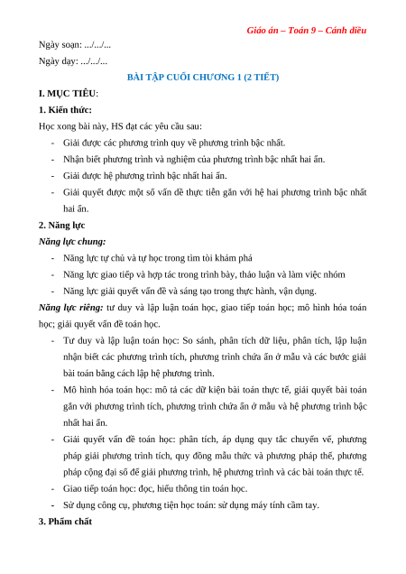 Giáo án Bài tập cuối chương 1 Toán 9 Cánh diều