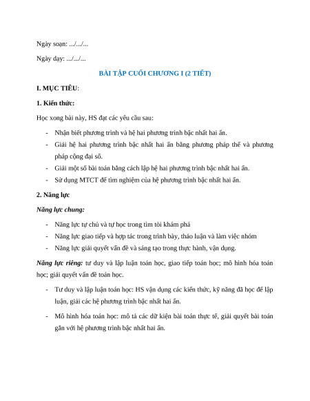 BÀI TẬP CUỐI CHƯƠNG I (2 TIẾT) I. MỤC TIÊU: