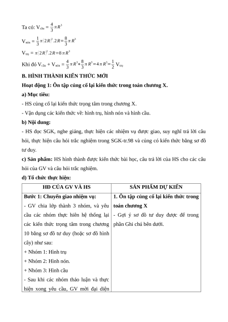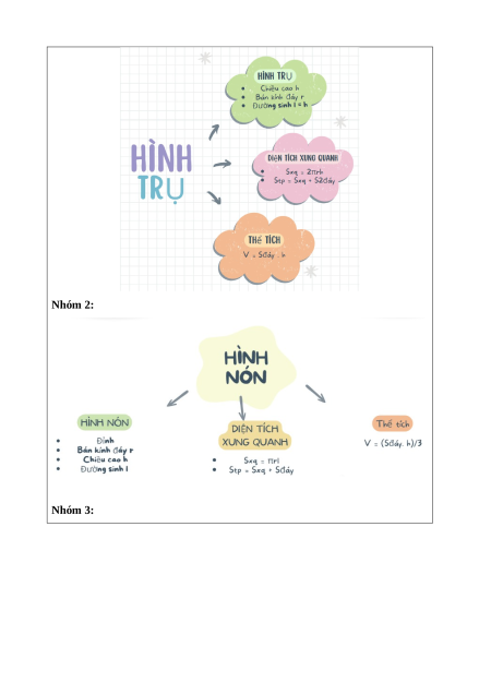 10 bằng sơ đồ tư duy (hoặc sơ đồ hình cây) như sau: + Nhóm 1: Hình trụ + Nhóm 2: Hình nón. + Nhóm 3: Hình cầu