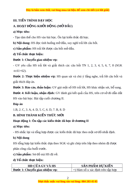 Đây là bản xem th , vu ử i lòng mua tài li u ệ đ xe ể m chi ti t ế (có l i ờ gi i ả ) III. TI N Ế TRÌNH D Y Ạ H C Ọ A. HOẠT ĐỘNG KH I Ở Đ N Ộ G (M Ở Đ U Ầ ) a) M c ụ tiêu: - T o ạ tâm th ế cho HS vào bài h c. ọ Ôn l i ạ ki n ế th c ứ đã h c. ọ b) N i ộ dung: HS đ c ọ tình hu n ố g m ở đ u ầ , suy nghĩ tr ả l i ờ câu h i ỏ . c) S n ả ph m ẩ : HS trả l i ờ đ c ượ câu h i ỏ m ở đ u ầ . d) T ổ ch c ứ th c ự hi n: ệ Bư c ớ 1: Chuy n ể giao nhi m ệ v : ụ - GV yêu c u ầ HS trả l i ờ và gi i ả thích các câu h i