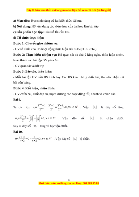 Đây là bản xem th , vu ử i lòng mua tài li u ệ đ xe ể m chi ti t ế (có l i ờ gi i ả ) a) M c ụ tiêu: H c ọ sinh c n ủ g c ố l i ạ ki n ế th c ứ đã h c. ọ b) N i ộ dung: HS v n ậ d n ụ g các ki n ế th c ứ c a ủ bài h c ọ làm bài t p ậ c) S n ả ph m ẩ h c ọ t p: ậ Câu tr ả l i ờ c a ủ HS. d) T ổ ch c ứ th c ự hi n: ệ Bư c ớ 1: Chuy n ể giao nhi m ệ v : ụ - GV t ổ ch c ứ cho HS ho t ạ đ n ộ g th c ự hi n ệ Bài 9-15 (SGK -tr.62) Bư c ớ 2: Th c ự hi n ệ nhi m ệ v :