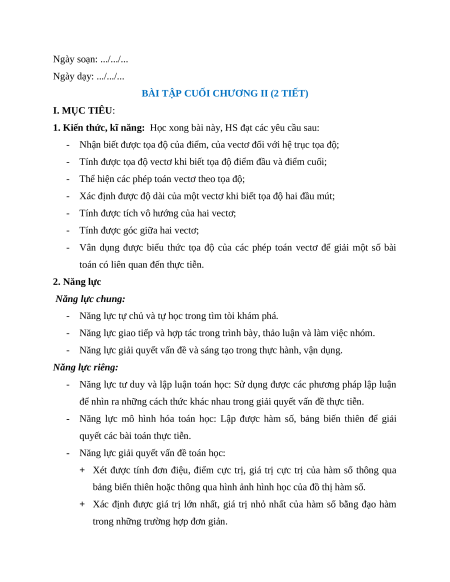 BÀI TẬP CUỐI CHƯƠNG II (2 TIẾT) I. MỤC TIÊU: