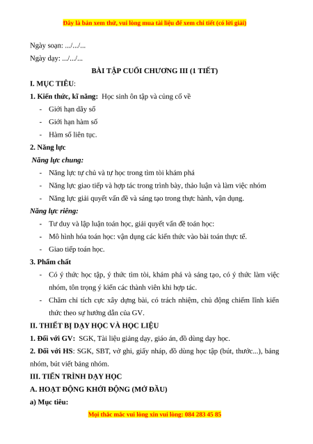 Giáo án Bài tập cuối chương 3 Toán 11 Cánh diều