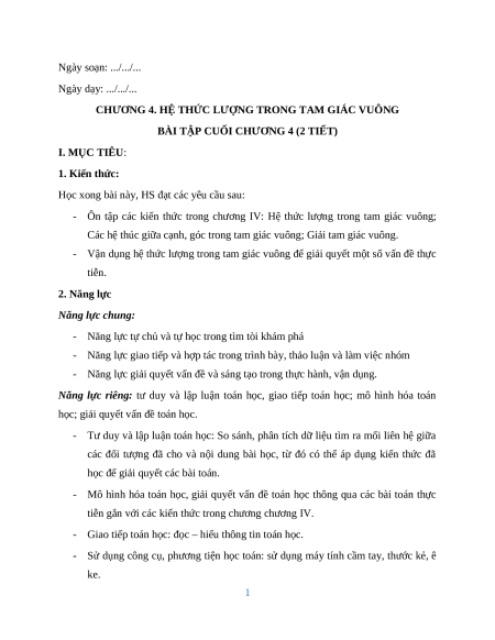 - Vận dụng hệ thức lượng trong tam giác vuông để giải quyết một số vấn đề thực tiễn. 2. Năng lực