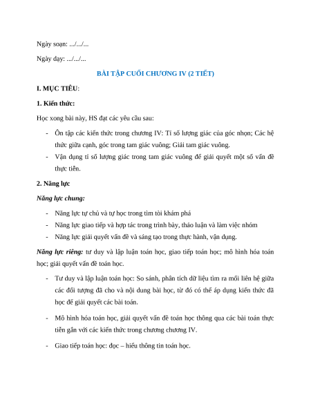 BÀI TẬP CUỐI CHƯƠNG IV (2 TIẾT) I. MỤC TIÊU: