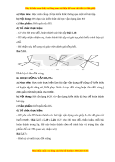 ậ xét, bổ sung và giáo viên đánh giá t ng k ổ t ế . Bài 5.18 : Hình b) có tâm đ i ố x ng ứ D. HOẠT Đ N Ộ G VẬN D N Ụ G a) M c ụ tiêu: H c ọ sinh th c ự hi n ệ làm bài t p ậ v n ậ d ng ụ đ ể c ng ủ c ố ki n ế th c ứ và luy n ệ t p ậ ki năng v , ẽ khôi ph c ụ hình có tr c ụ đ i ố x ng ứ ho c ặ tâm đ i ố x ng ứ ( đ n gi ơ n) ả t m ừ t ộ ph n cho t ầ rư c. ớ b) N i ộ dung: HS sử d ng ụ SGK và v n ậ d ng ụ ki n ế th c ứ đã h c ọ đ ể hoàn thành bài t p. ậ c) Sản ph m ẩ : K t ế qu c ả a ủ HS.