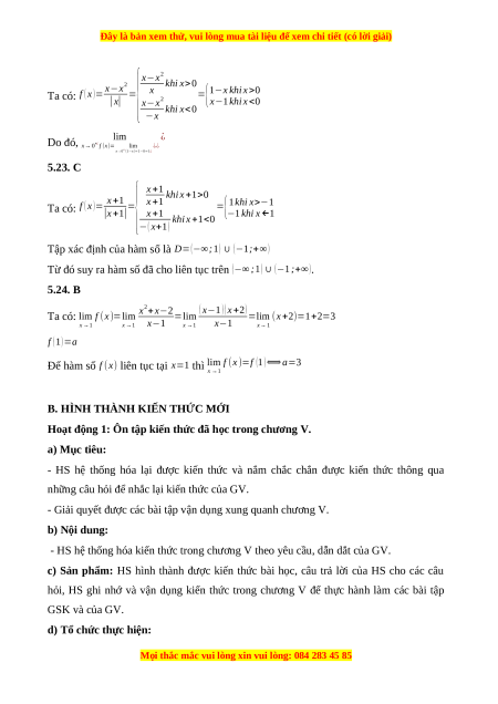 Từ đó suy ra hàm số đã cho liên tục trên (−∞ ;1)∪ (−1;+∞). 5.24. B ( Ta có: x2 x−1 )( x +2) lim f (x )=lim +x−2 =lim =lim (x+2)=1+2=3 x →1 x →1 x−1 x →1 x−1 x→ 1 f (1)=a