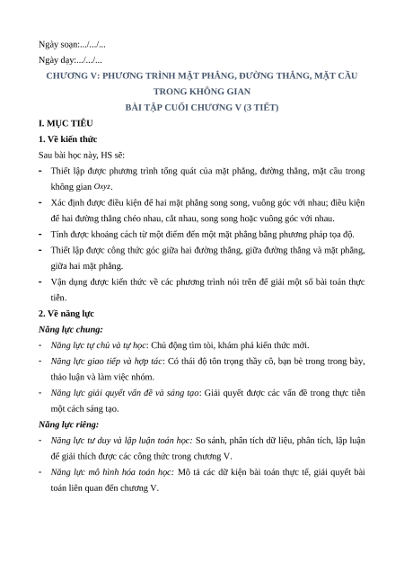 CHƯƠNG V: PHƯƠNG TRÌNH MẶT PHẲNG, ĐƯỜNG THẲNG, MẶT CẦU TRONG KHÔNG GIAN