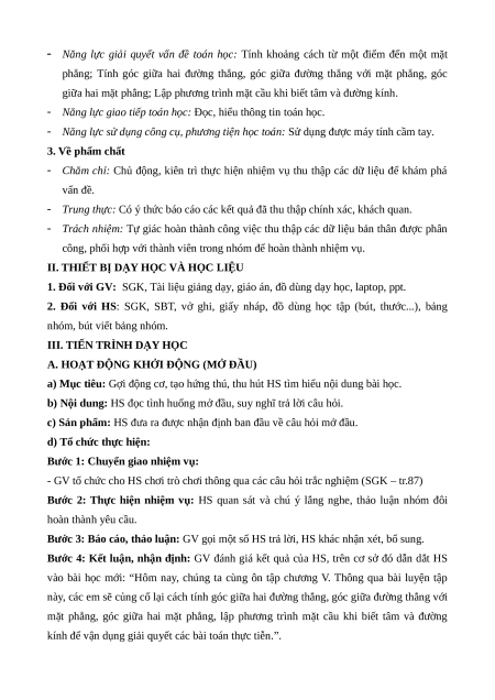 a) Mục tiêu: Hệ thống lại lý thuyết về phương trình mặt phẳng, đường thẳng, mặt cầu trong không gian.