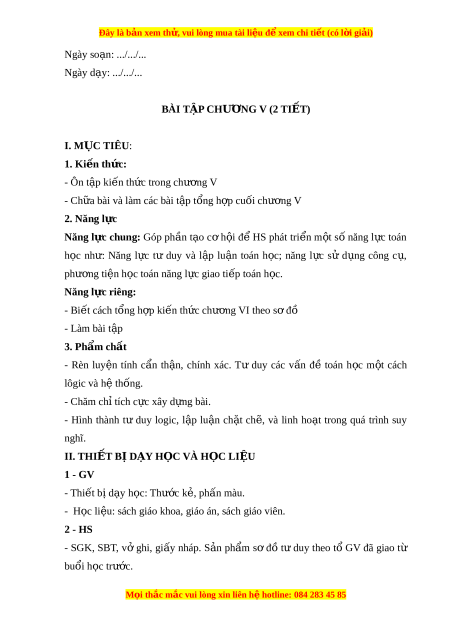 Đây là bản xem th , vu ử i lòng mua tài li u ệ đ xe ể m chi ti t ế (có l i ờ gi i ả ) Ngày so n: ạ .../.../... Ngày d y: ạ .../.../... BÀI TẬP CHƯ N Ơ G V (2 TI T Ế ) I. M C Ụ TIÊU: 1. Ki n t ế h c ứ : - Ôn t p ậ ki n t ế h c t ứ rong chư ng ơ V
