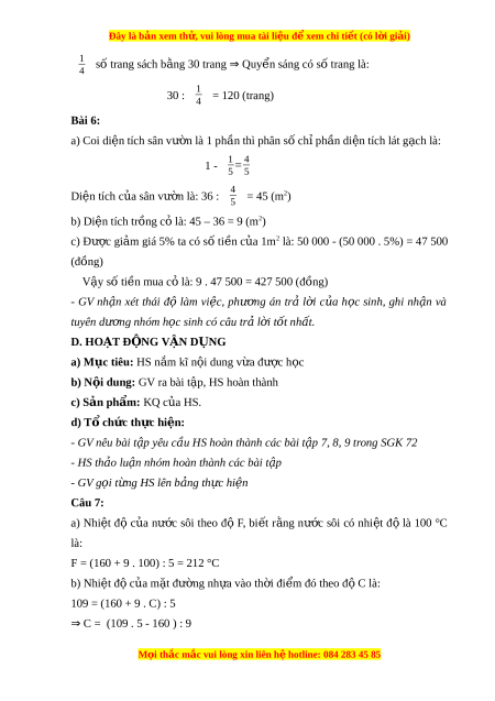 Đây là bản xem th , vu ử i lòng mua tài li u ệ đ xe ể m chi ti t ế (có l i ờ gi i ả ) 1 số trang sách b ng 30 t ằ rang ⇒ Quy n s ể áng có số trang là: 4 1 30 : = 120 (trang) 4 Bài 6: a) Coi di n t ệ ích sân vư n ờ là 1 ph n t ầ hì phân s ch ố ph ỉ n di ầ n t ệ ích lát g ch ạ là: 1 4 1 - = 5 5 Di n t ệ ích c a s ủ ân vư n l ờ 4 à: 36 : = 45 (m2) 5 b) Di n t ệ ích tr ng c ồ ỏ là: 45 – 36 = 9 (m2) c) Đư c ợ gi m ả giá 5% ta có s ố ti n ề c a