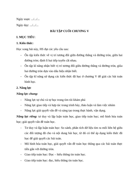- Ôn tập kiến thức về vị trí tương đối giữa đường thẳng và đường tròn, giữa hai