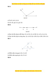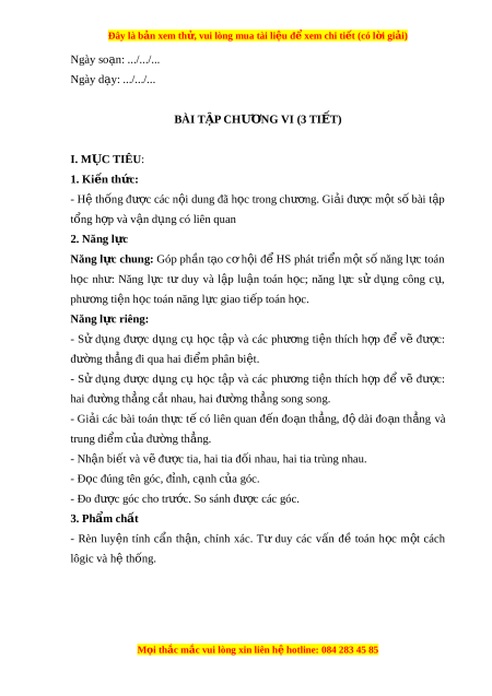 Đây là bản xem th , vu ử i lòng mua tài li u ệ đ xe ể m chi ti t ế (có l i ờ gi i ả ) Ngày so n: ạ .../.../... Ngày d y: ạ .../.../... BÀI TẬP CHƯ N Ơ G VI (3 TI T Ế ) I. M C Ụ TIÊU: 1. Ki n t ế h c ứ : - Hệ thống đư c ợ các n i ộ dung đã h c ọ trong chư ng. ơ Gi i ả đư c ợ m t ộ s bài ố t p ậ tổng h p ợ và v n d ậ ng có ụ liên quan 2. Năng l c ự Năng l c ự chung: Góp ph n ầ t o ạ c ơ h i ộ đ ể HS phát tri n ể m t ộ s ố năng l c ự toán h c ọ nh : ư Năng l c ự tư duy và l p ậ lu n ậ toán h c; ọ năng l c ự sử d ng ụ công c , ụ phư ng t ơ i n h ệ c t ọ oán năng l c gi ự ao ti p t ế oán h c. ọ Năng l c ự riêng: - Sử d ng ụ được d ng ụ cụ h c ọ t p ậ và các phư ng ơ ti n ệ thích h p ợ để vẽ đư c: ợ đư ng t ờ h ng ẳ đi qua hai đi m ể phân bi t ệ . - Sử d ng ụ được d ng ụ cụ h c ọ t p ậ và các phư ng ơ ti n ệ thích h p ợ để vẽ đư c: ợ hai đư ng t ờ h ng ẳ c t ắ nhau, hai đư ng t ờ h ng s ẳ ong song. - Gi i ả các bài toán th c ự t ế có liên quan đ n ế đo n ạ th ng, ẳ đ ộ dài đo n ạ th ng ẳ và trung đi m ể c a ủ đư ng t ờ h ng. ẳ - Nh n ậ bi t ế và v đ ẽ ư c ợ tia, hai tia đ i ố nhau, hai tia trùng nhau. - Đ c ọ đúng tên góc, đ nh, c ỉ nh ạ c a góc ủ . - Đo được góc cho trư c ớ . So sánh đư c các ợ góc. 3. Ph m ẩ chất - Rèn luy n ệ tính c n ẩ th n,