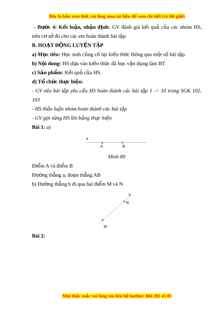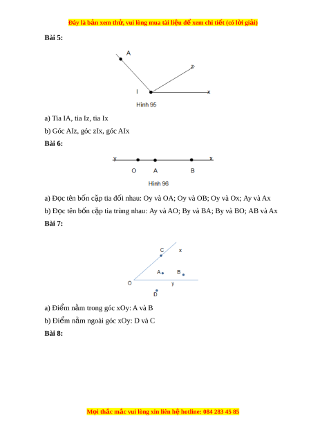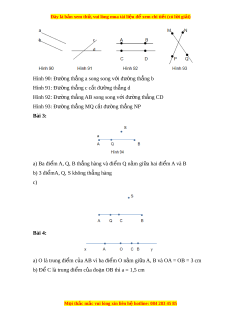 Đây là bản xem th , vu ử i lòng mua tài li u ệ đ xe ể m chi ti t ế (có l i ờ gi i ả ) Hình 90: Đư ng t ờ h ng ẳ a song song v i ớ đư ng t ờ h ng ẳ b Hình 91: Đư ng t ờ h ng ẳ c c t ắ đư ng ờ th ng d ẳ Hình 92: Đư ng t ờ h ng ẳ AB song song v i ớ đư ng t ờ h ng C ẳ D Hình 93: Đư ng t ờ h ng ẳ MQ c t ắ đư ng t ờ h ng ẳ NP Bài 3: a) Ba đi m ể A, Q, B th ng hàng ẳ và đi m ể Q n m ằ gi a hai ữ đi m ể A và B b) 3 đi m ể A, Q, S không th ng ẳ hàng c) Bài 4: a) O là trung đi m ể c a ủ AB vì ba đi m ể O n m ằ gi a ữ A, B và OA = OB = 3 cm b) Để C là trung đi m ể c a đo ủ n ạ OB thì a = 1,5 cm M i ọ thắc m c