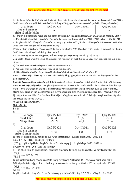 ⇒ Bài tập cuối chương VI. Gợi ý đáp án: Bài 1: a) Giai đoạn Quý I/2020 Quý I/2021 Quý I/2022 Xuất khẩu 63,4 78,56 89,1 Nhập khẩu 59,59 76,1 87,64 b) Giai đoạn Quý I/2020 Quý I/2021 Quý I/2022 Tỉ số giá trị xuất 1,06 1,03 1,02 khẩu và nhập khẩu