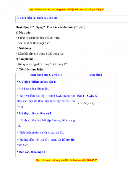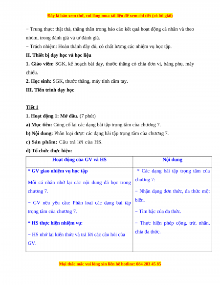 − Củng cố và vận dụng các dạng bài tập về cộng, trừ, nhân chia đa thức một biến.