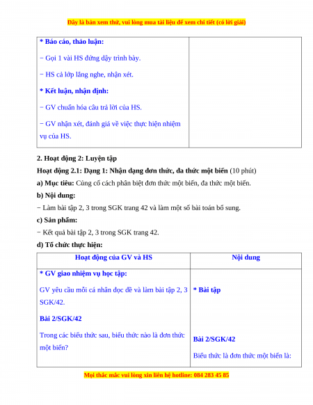 Hoạt động 2.1: Dạng 1: Nhận dạng đơn thức, đa thức một biến (10 phút)