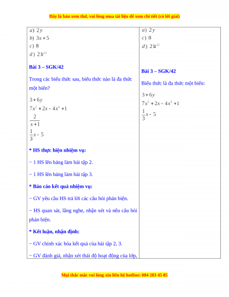 a) Mục tiêu: Củng cố cách phân biệt đơn thức một biến, đa thức một biến. b) Nội dung: