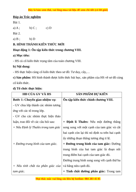- HS củ cố kiến thức trọng tâm của toán chương VIII. b) Nội dung: