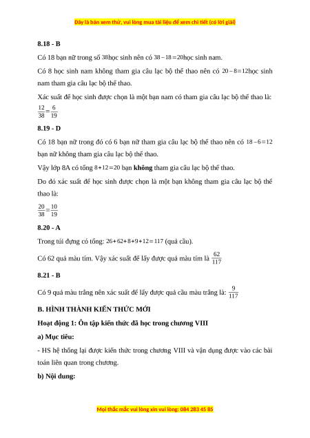 Do đó xác suất để học sinh được chọn là một bạn không tham gia câu lạc bộ thể thao là: 20 =10 38 19 8.20 - A