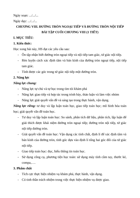 - Tính được các góc trong tứ giác nội tiếp một đường tròn. 2. Năng lực