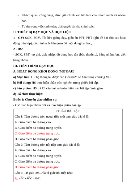 - Ôn tập nhận biết đường tròn ngoại tiếp và nội tiếp tam giác, tứ giác nội tiếp.