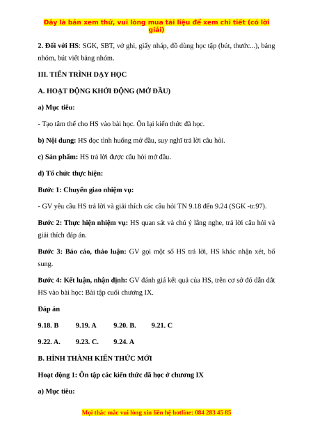HS vào bài học: Bài tập cuối chương IX. Đáp án 9.18. B 9.19. A 9.20. B. 9.21. C 9.22. A. 9.23. C. 9.24. A