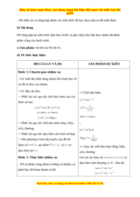 - GV mời đại diện từng nhóm lên trình bày về sơ đồ tư duy của nhóm. - GV đặt câu hỏi: +) Tính đạo hàm
