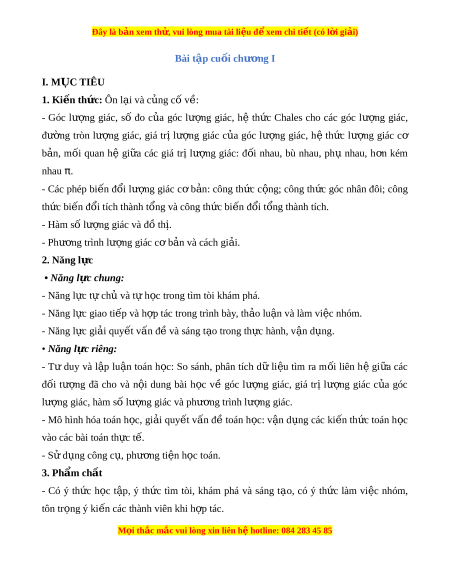 Đây là bản xem th , vu ử i lòng mua tài li u ệ đ xe ể m chi ti t (c ế ó l i ờ gi i ả ) Bài t p cu ậ i ố chư ng ơ I I. M C Ụ TIÊU 1. Ki n t ế h c: ứ Ôn l i ạ và c ng ủ c v ố : ề - Góc lư ng ợ giác, số đo c a ủ góc lư ng ợ giác, hệ th c