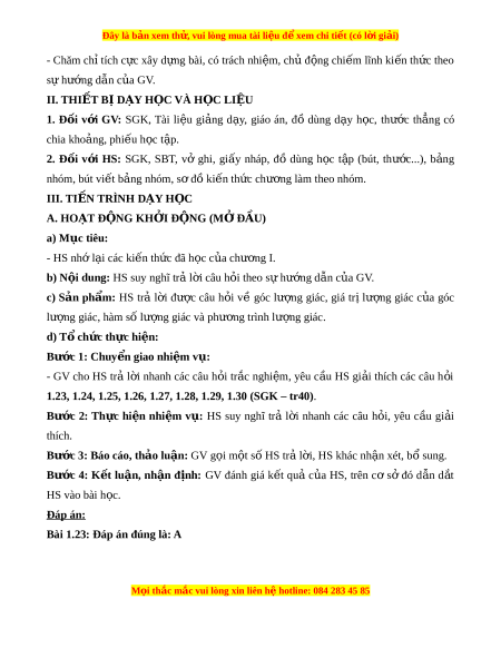 ợ ác trong trình bày, th o ả lu n ậ và làm vi c nhóm ệ . - Năng l c gi ự i ả quy t ế v n đ ấ và s ề áng t o t ạ rong th c ự hành, v n d ậ ng. ụ • Năng l c r ự iêng: - Tư duy và l p ậ lu n ậ toán h c: ọ So sánh, phân tích d ữ li u ệ tìm ra m i ố liên h ệ gi a ữ các đối tư ng ợ đã cho và n i ộ dung bài h c ọ về góc lư ng ợ giác, giá trị lư ng ợ giác c a ủ góc lư ng ợ giác, hàm s l ố ư ng gi ợ ác và phư ng t ơ rình lư ng gi ợ ác. - Mô hình hóa toán h c, ọ gi i ả quy t ế v n ấ đ ề toán h c: ọ v n ậ d ng ụ các ki n ế th c ứ toán h c ọ vào các bài toán th c t ự . ế - S d ử ng công c ụ , ụ phư ng t ơ i n h ệ c t ọ oán. 3. Phẩm ch t ấ - Có ý th c ứ h c ọ t p ậ , ý th c
